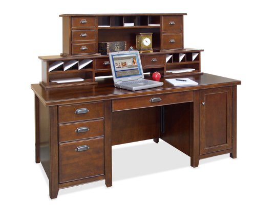 Kathy Ireland Tribeca Loft Cherry collection computer desk with hutch is constructed of hardwood solids and veneers, with a warm handrubbed Burnt Umber Cherry finish and cast iron hardware. This contemporary computer desk features a locking letter/ legal file drawer, two box drawers, and a pencil drawer with dropfront (33/4''H) that can convert to a keyboard tray. Right pedestal has a CPU storage compartment (153/8''W x 17''D x 203/4''H) with an adjustable shelf and builtin surge protector. Desktop grommet helps keep cords in order.Long Reception Hutch is loaded with features including letter/legal file slots, three small storage compartments (52/3''W x 103/4''D x 4''H), five envelope slots (32/5''W x 103/4''D x 4''H), three drawers (81/8''W x 103/4''D x 41/16''H) and wire management slot in back. The back is unfinished. Dimensions: 64''W x 121/4''D x 10''H. Short reception hutch with 5 drawers offer convenient storage. Three drawers on the left are 77/8''W x 81/4''D x 41/16''H, two drawers on the right are 77/8''W x 81/4''D x 65/16''H. Upper level cubbies (43/4''W x 81/4''D x 4''H) provide easy access to envelopes, notes and messages. Lower open center storage (25''W x 81/4''D x 91/2''H) can put books at your finger tips. Finished back. Overall dimension 48''W x 113/4''D x 15''H.Ships fully assembled. Read more...