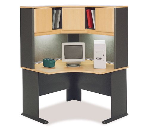 Bush Series A Beech modular corner desk with hutch is constructed of top quality engineered wood with a durable Savannah Beech and Slate Gray laminate finish.Desk features an integrated wire management system and protective PVC edge banding. Feet are solid molded hardwood. Hutch features three hidden storage compartments (133/8''W x 117/8''D x 13''H) with fully finished interiors and two vertical storage slots (33/4''W x 117/8''D x 13''H). Includes two fabriccovered tack boards for posting important notes or reminders. Two task lights are included and mount on underside of hutch.Ships ready to assemble. Read more...